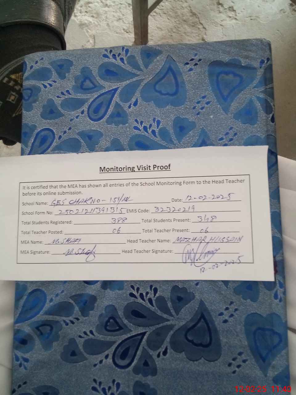 | Attendance Register | Head Teacher | MEA with School | Visit Proof |