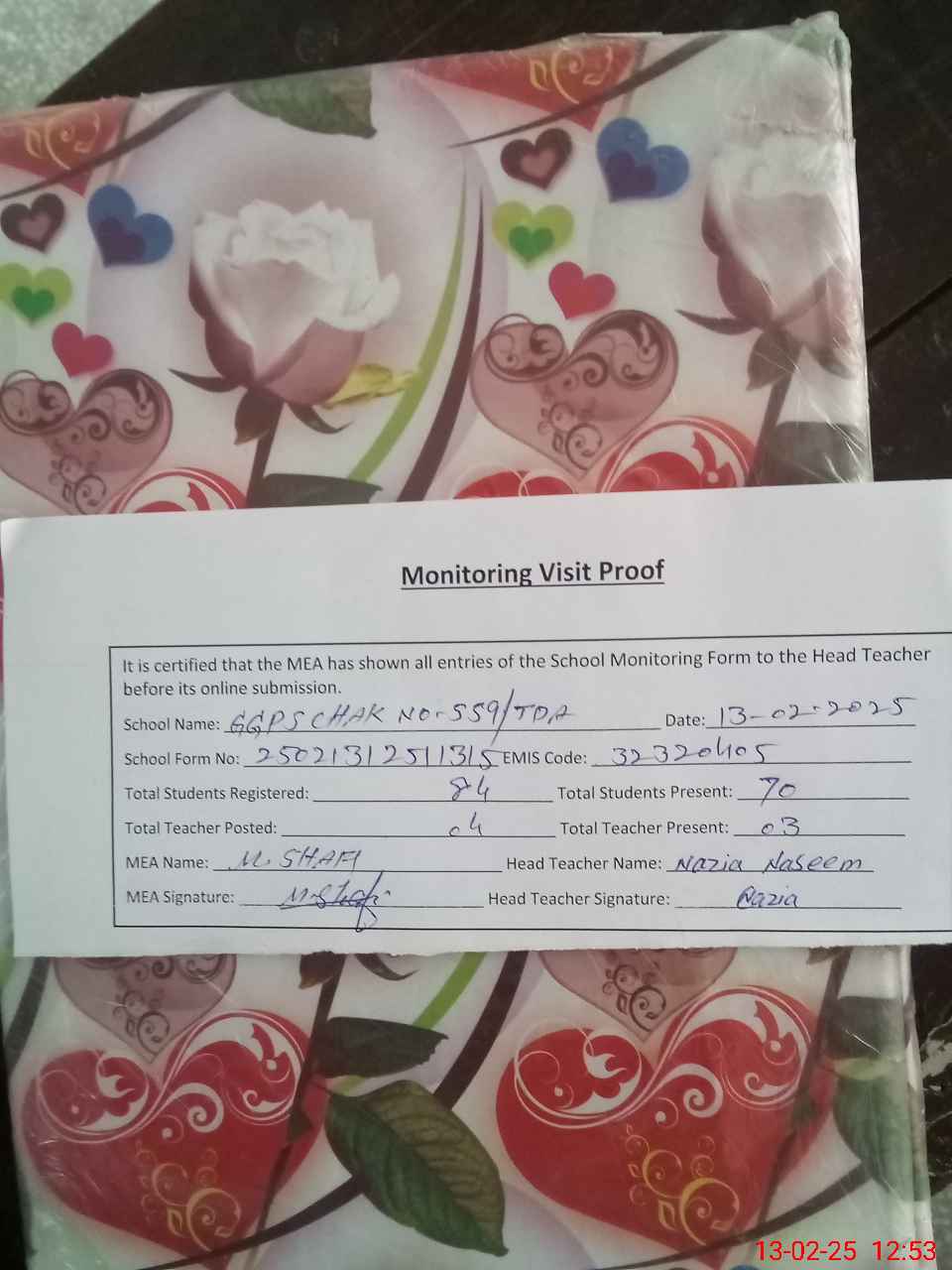 | Attendance Register | Head Teacher | MEA with School | Visit Proof |