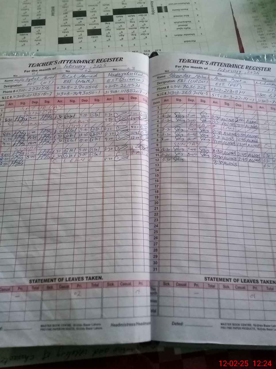| CNIC | Full Name | Designation | R/C | Absence During Last Calender Month |