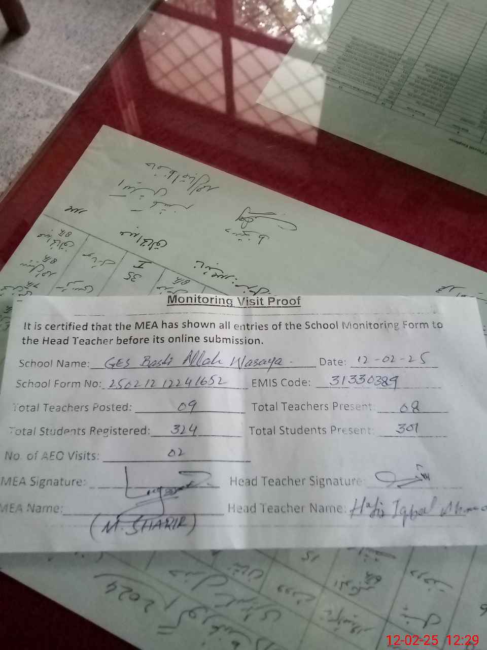 | Attendance Register | Head Teacher | MEA with School | Visit Proof |