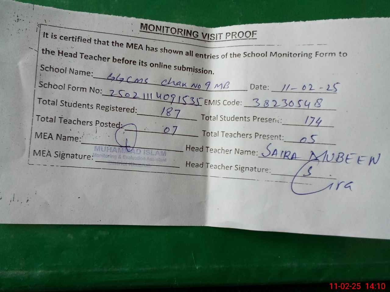 | Attendance Register | Head Teacher | MEA with School | Visit Proof |