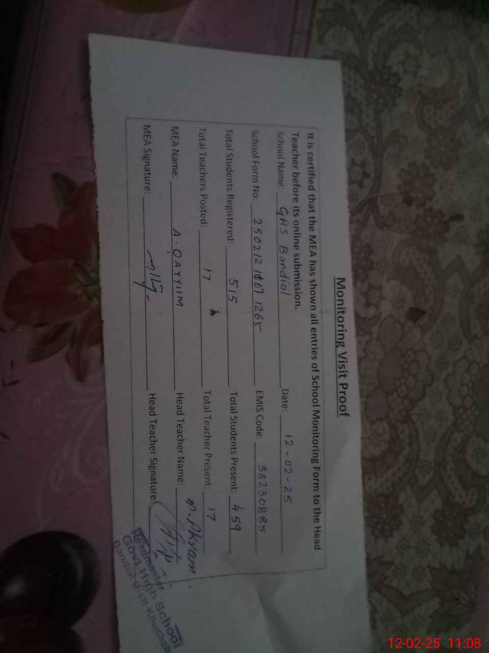 | Attendance Register | Head Teacher | MEA with School | Visit Proof |