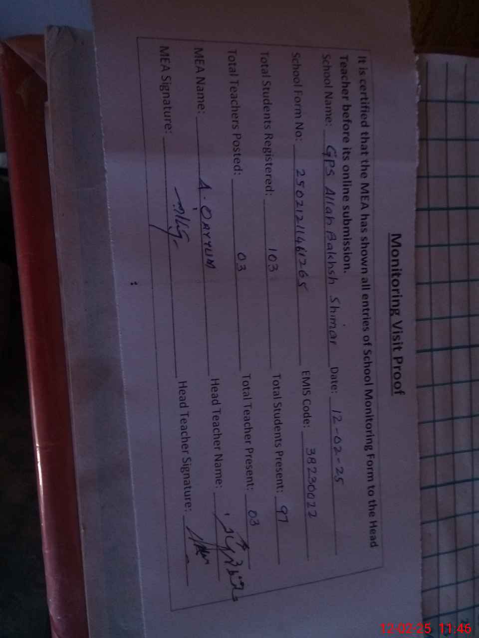 | EMIS Code: 38230022 | Name of School: GPS ALLAH BAKHSH SHUMAR | |||