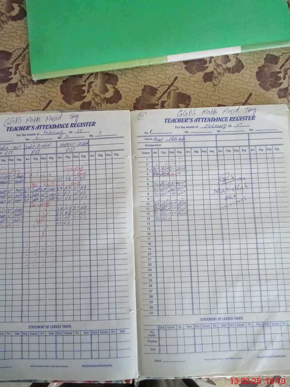 | Total no. of Classrooms: 3 No. of Classrooms Used for Teaching: 2 No. of Classrooms Storing Old Furniture, FTBs, etc: 0Comments if Any: One room partially dangerous D 3 form not available one Toilet nonfunctional second toilet cleaning poor no soap at wash point no attendance of students today at attendence register PST Teacher Sadia and PST Teacher Nadia iram absent no leave record ava |