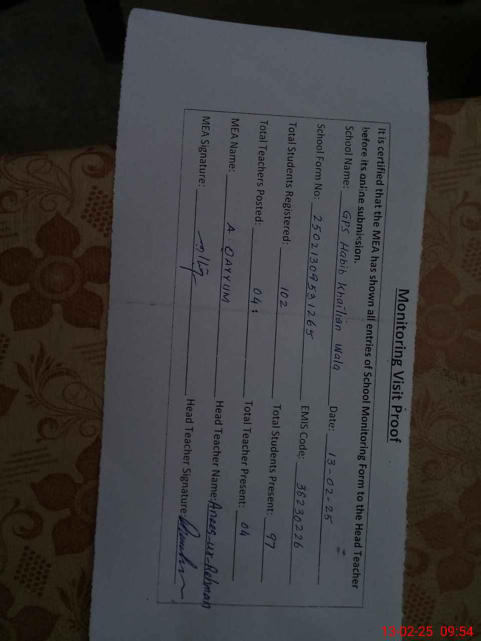 | EMIS Code: 38230226 | Name of School: GPS HABIB KHAILAN WALA | |||