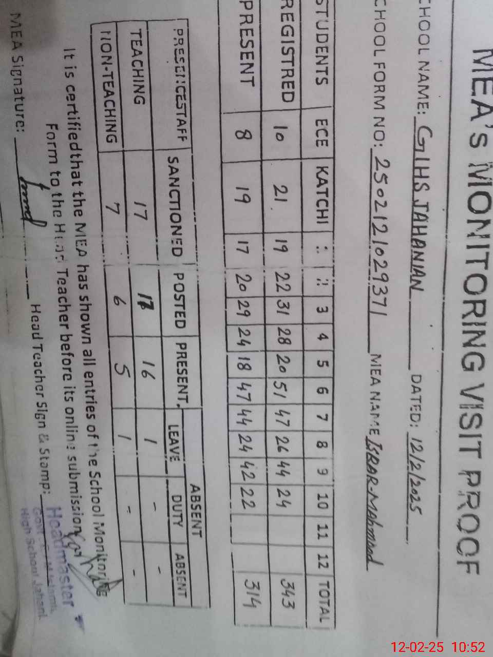 | Attendance Register | Head Teacher | MEA with School | Visit Proof |