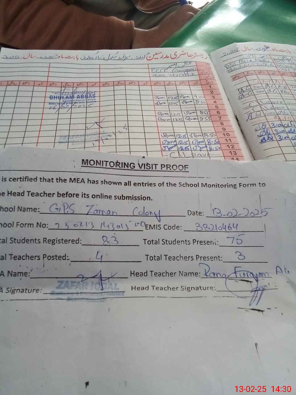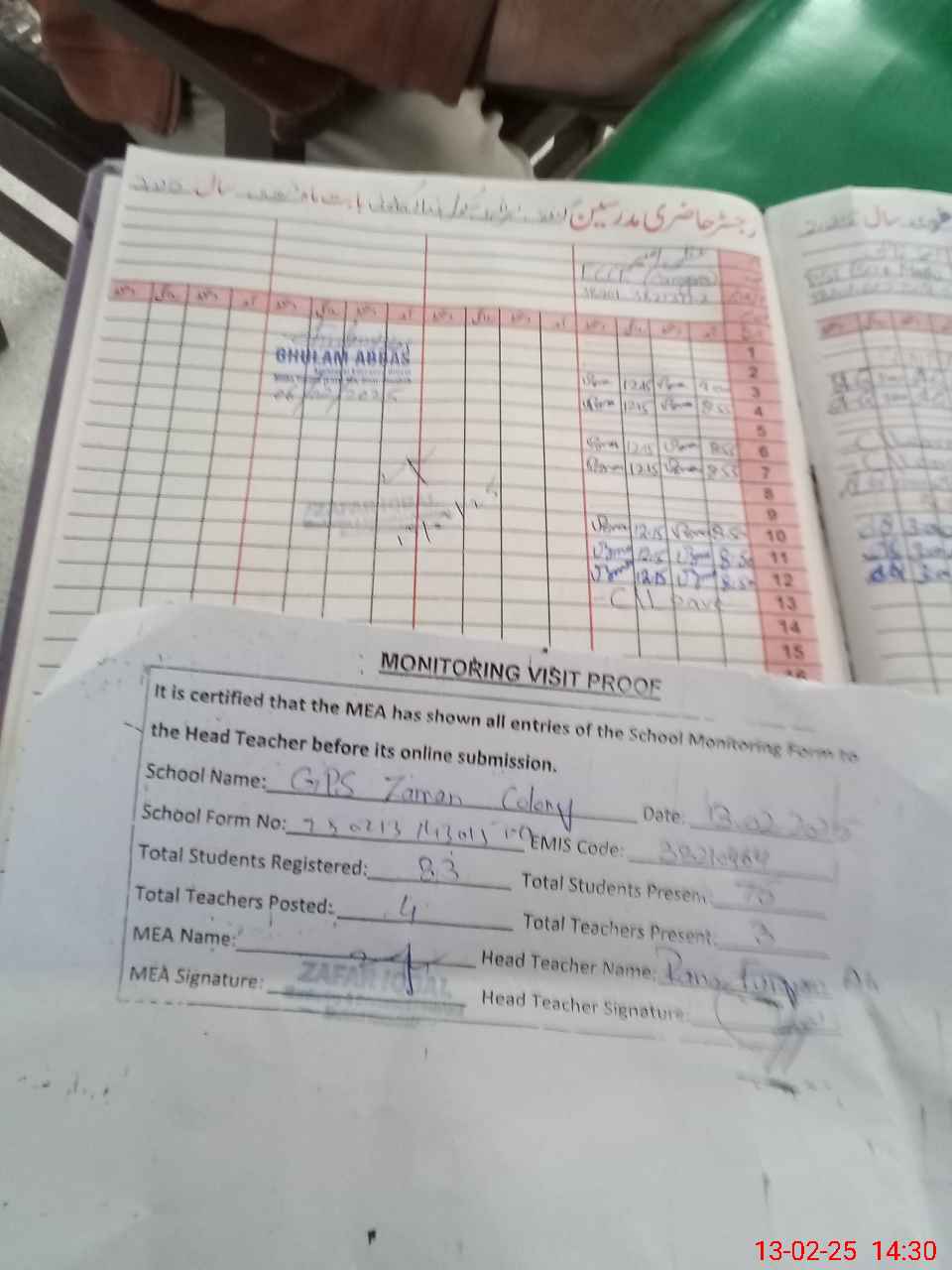 | Attendance Register | Head Teacher | MEA with School | Visit Proof |
