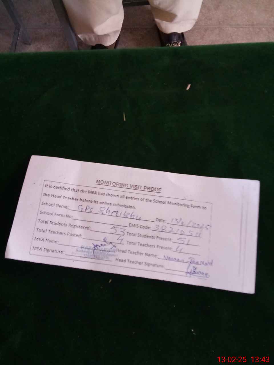 | Attendance Register | Head Teacher | MEA with School | Visit Proof |