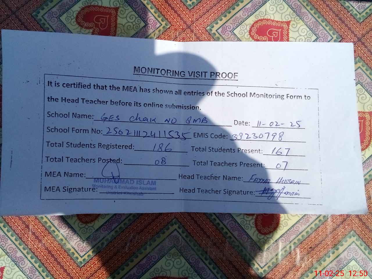 | Attendance Register | Head Teacher | MEA with School | Visit Proof |