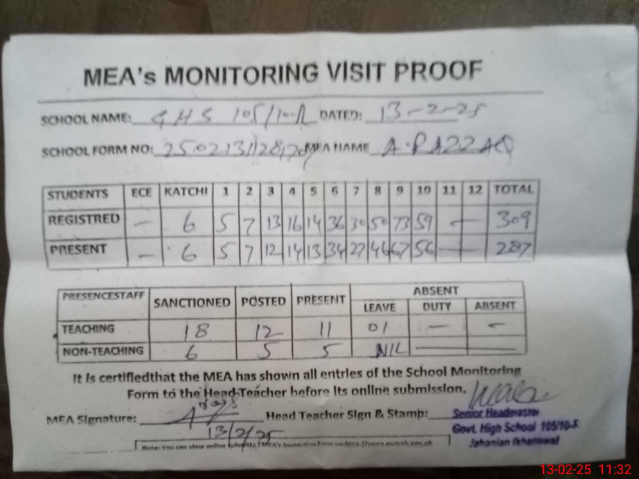 | Attendance Register | Head Teacher | MEA with School | Visit Proof |