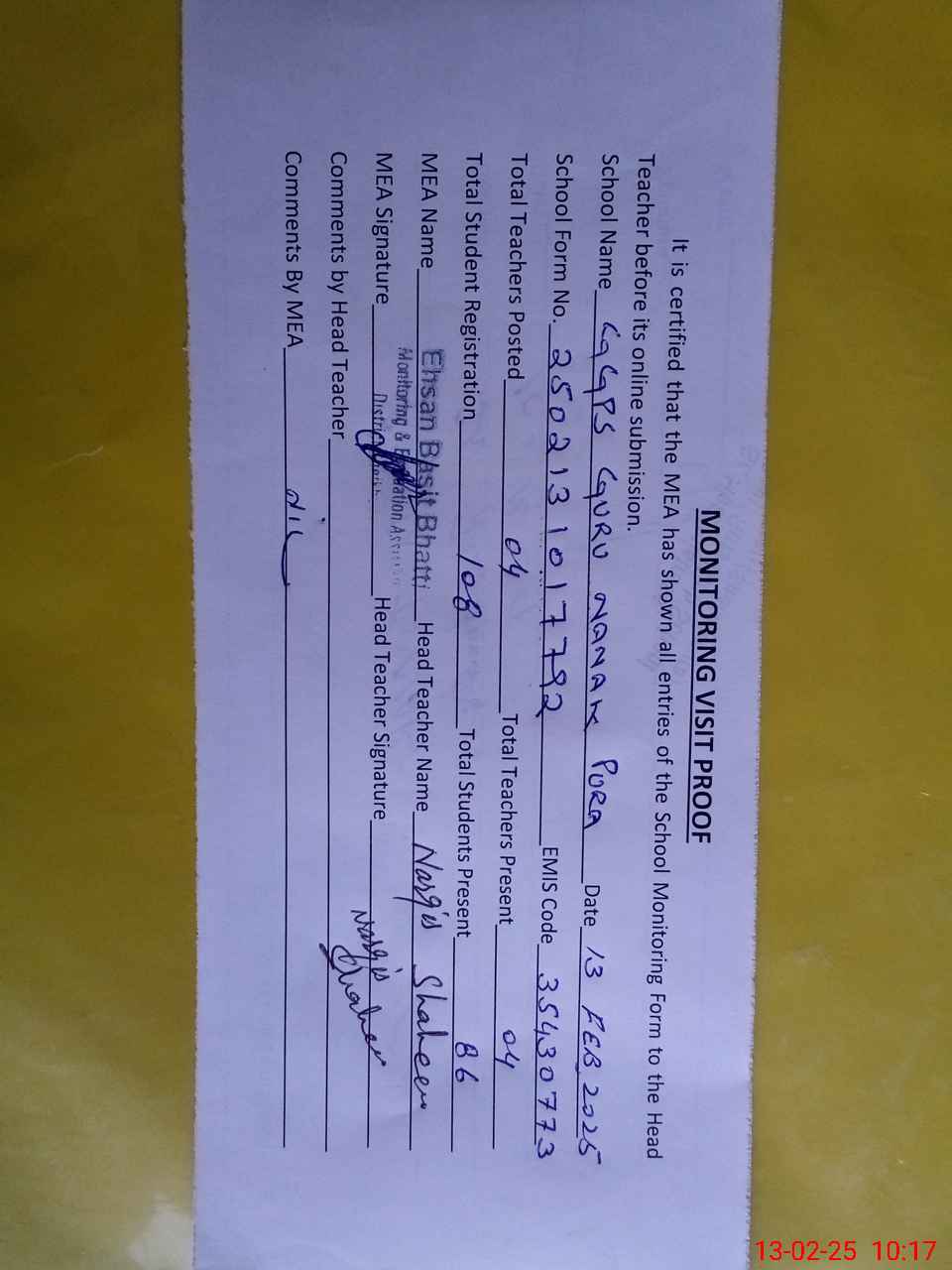 | Attendance Register | Head Teacher | MEA with School | Visit Proof |