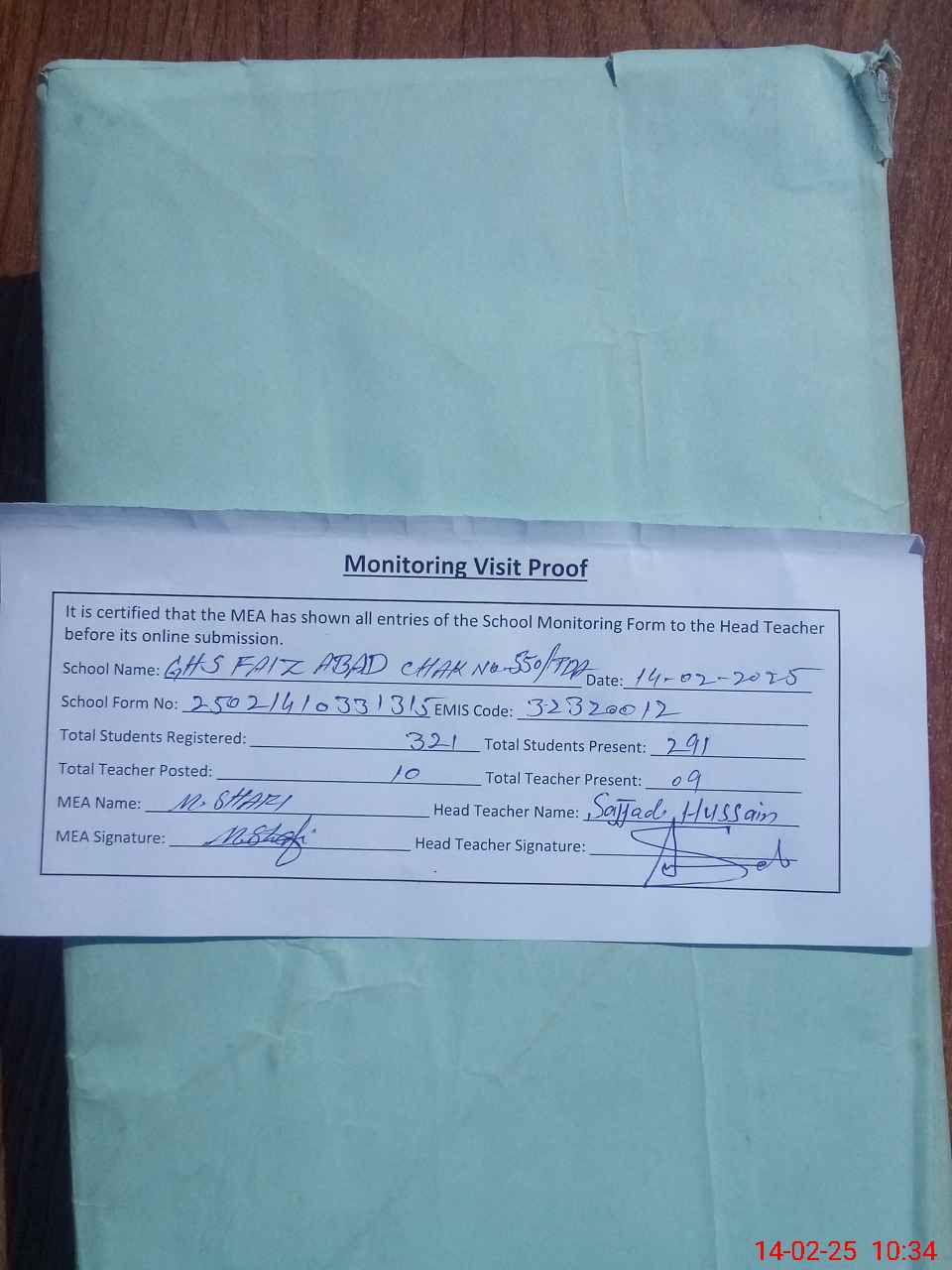 | EMIS Code: 32320012 | Name of School: GHS FAIZ ABAD CHAK NO.550/TDA | |||