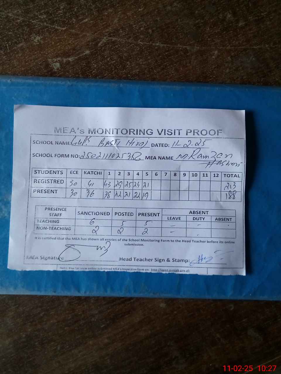 | Attendance Register | Head Teacher | MEA with School | Visit Proof |