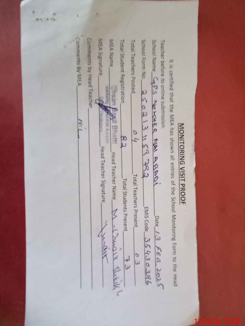 | Attendance Register | Head Teacher | MEA with School | Visit Proof |