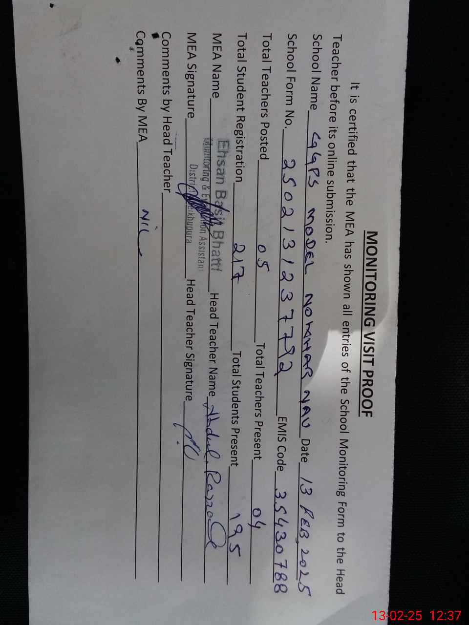 | Attendance Register | Head Teacher | MEA with School | Visit Proof |
