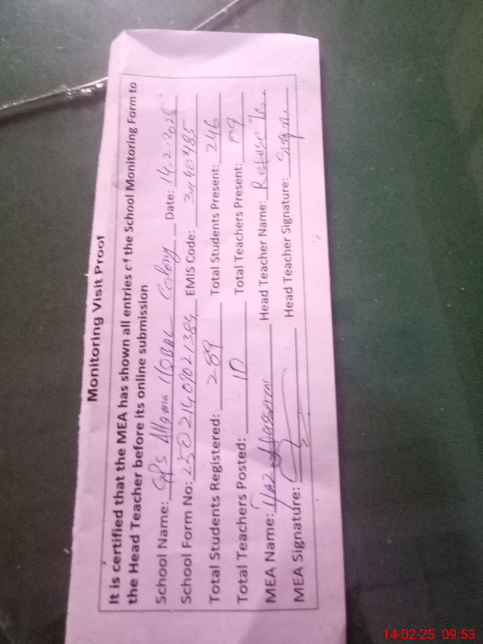 | Attendance Register | Head Teacher | MEA with School | Visit Proof |