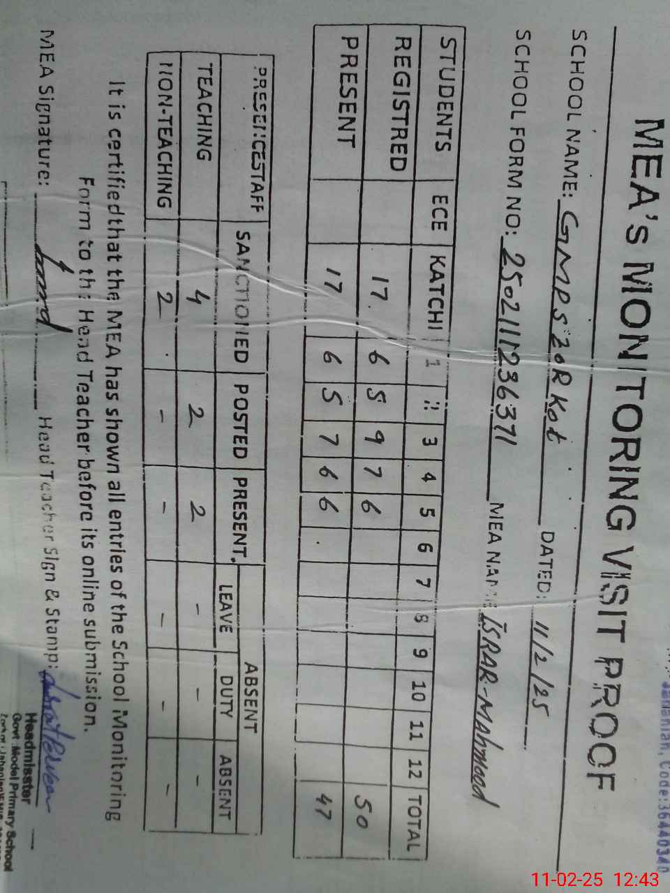 | Attendance Register | Head Teacher | MEA with School | Visit Proof |