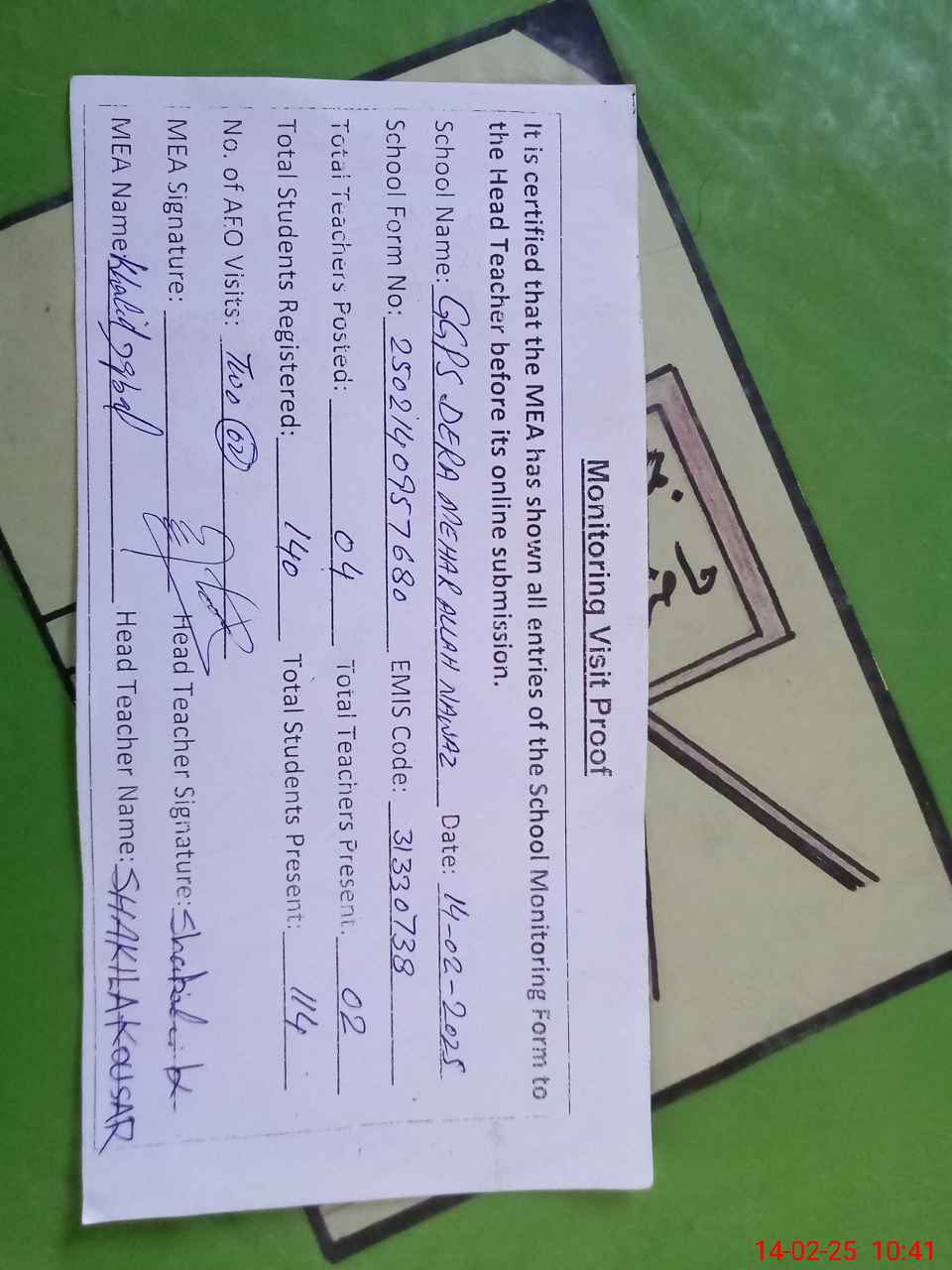 | Attendance Register | Head Teacher | MEA with School | Visit Proof |