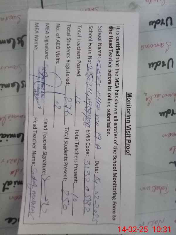 | Certified that this School was Inspected by the Undersigned MEA/DMO Today and the Information Stated Above is as Per Record. | |||||