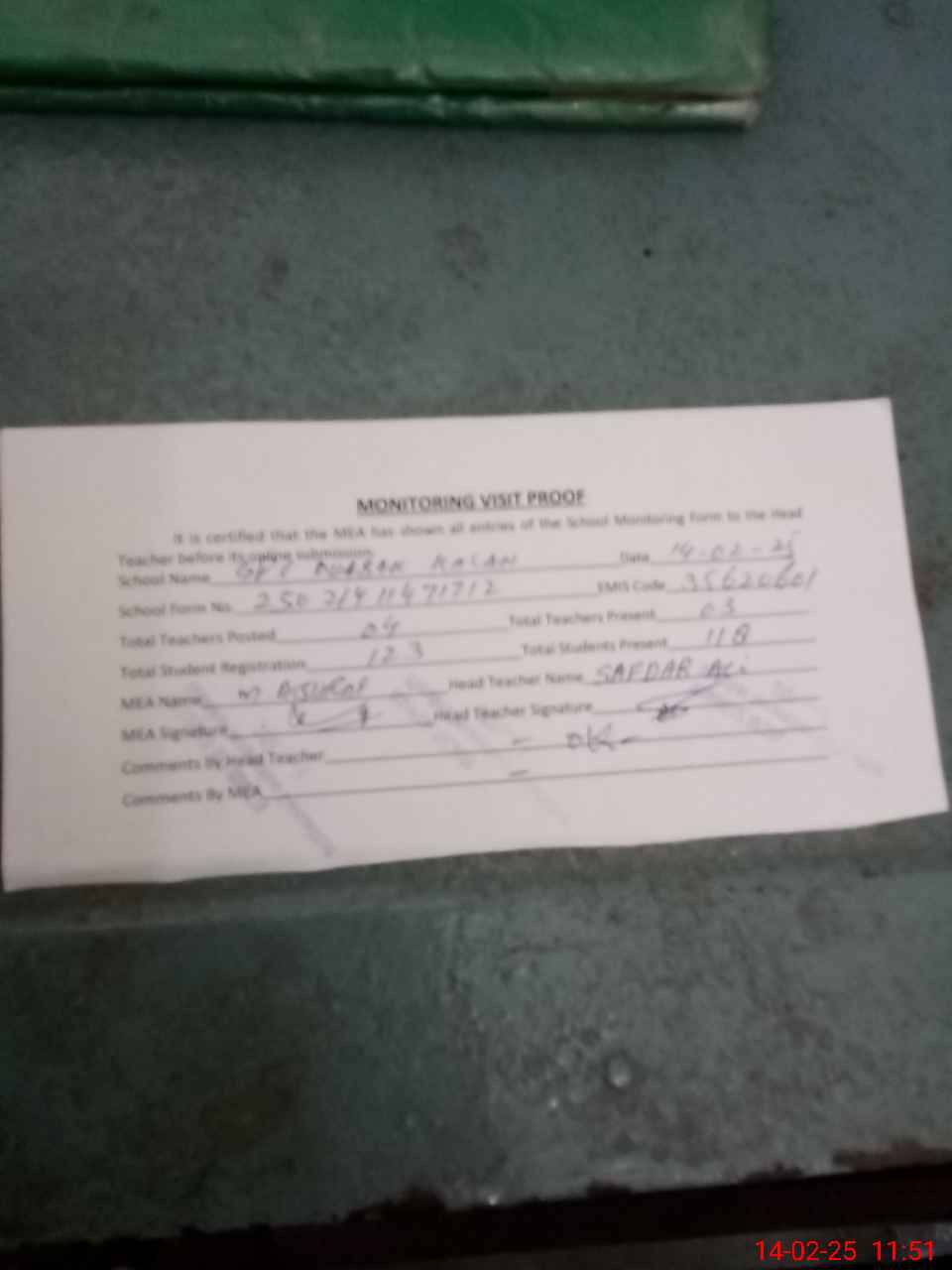 | Attendance Register | Head Teacher | MEA with School | Visit Proof |
