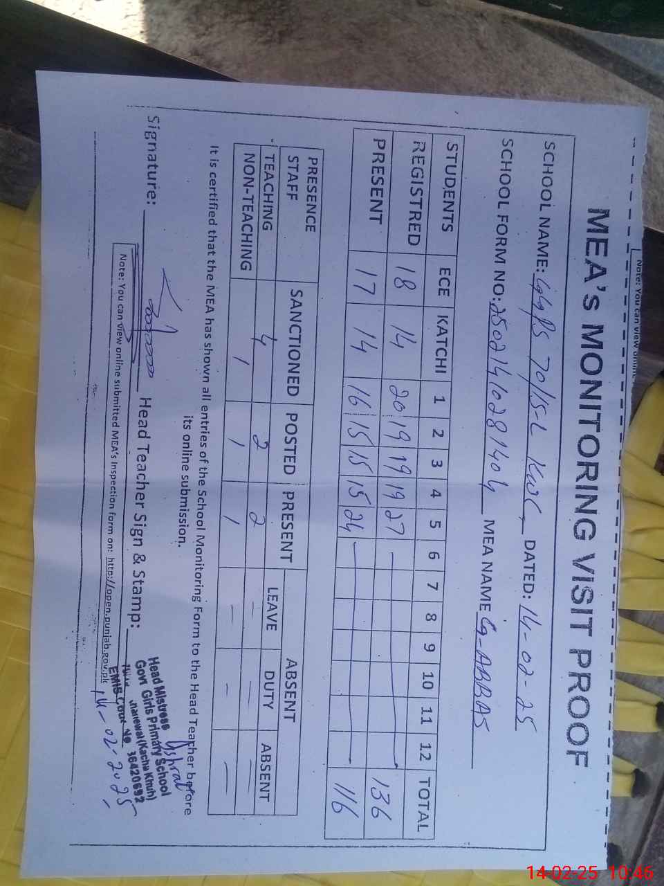 | Certified that this School was Inspected by the Undersigned MEA/DMO Today and the Information Stated Above is as Per Record. | |||||