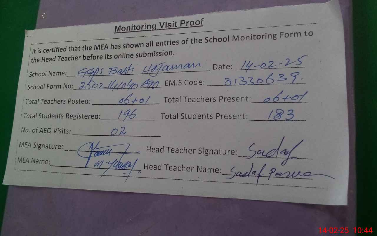 | Certified that this School was Inspected by the Undersigned MEA/DMO Today and the Information Stated Above is as Per Record. | |||||