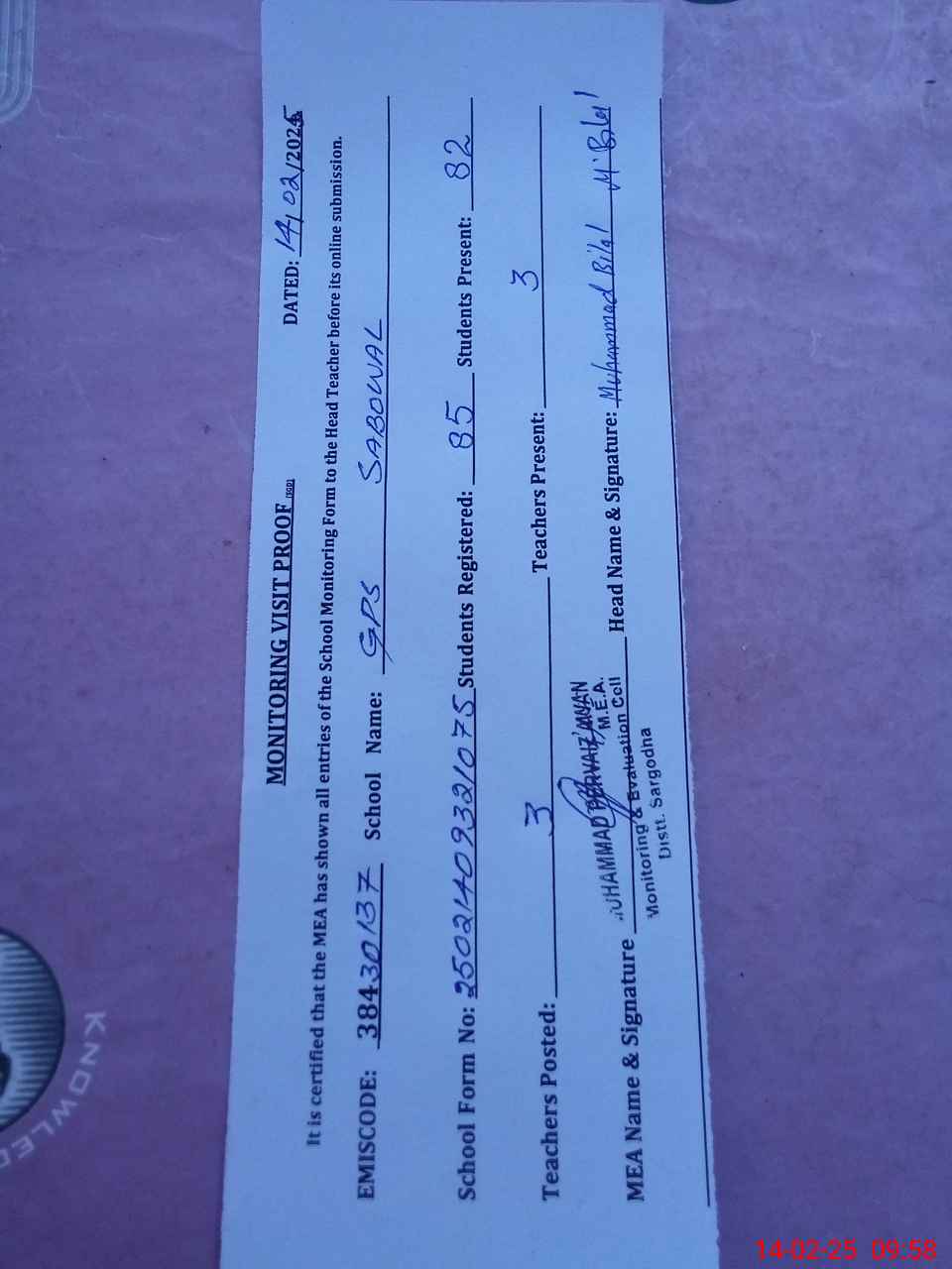 | Attendance Register | Head Teacher | MEA with School | Visit Proof |