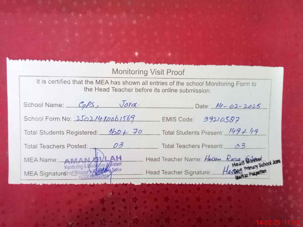 | EMIS Code: 39210587 | Name of School: GPS JORRA | |||