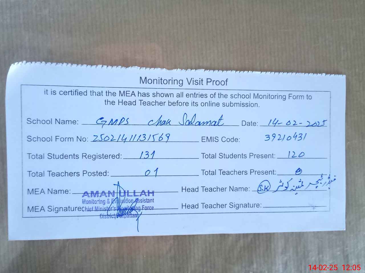 | EMIS Code: 39210431 | Name of School: GMPS CHAK SALAMAT | |||