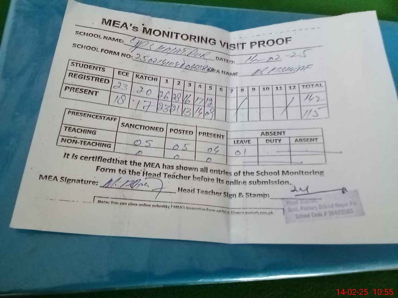 | Attendance Register | Head Teacher | MEA with School | Visit Proof |