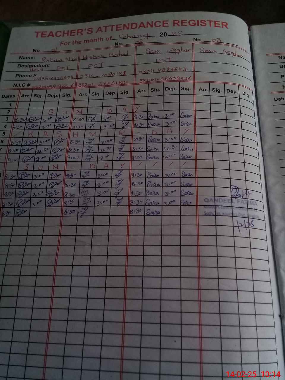 | CNIC | Full Name | Designation | R/C | Absence During Last Calender Month |