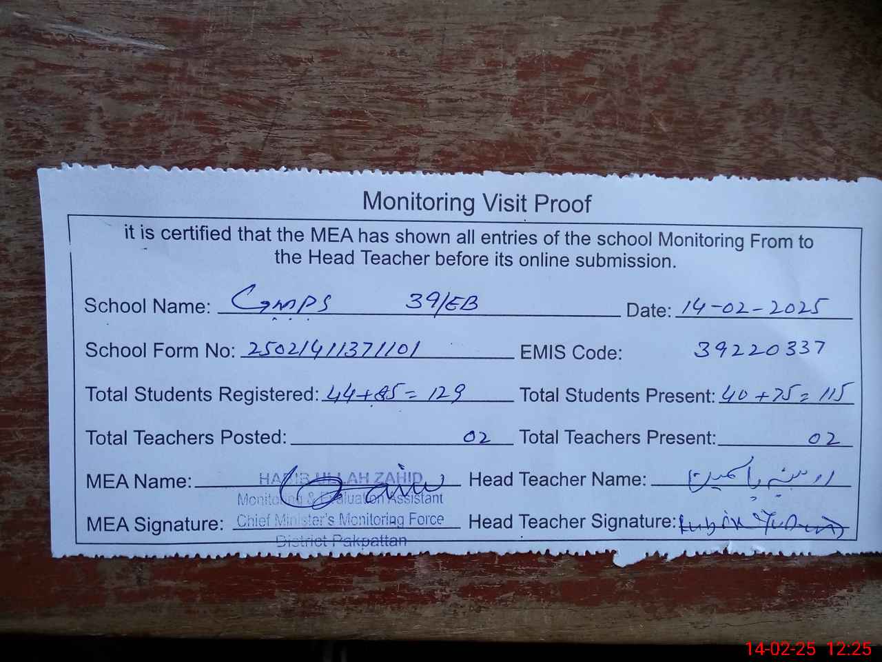 | Attendance Register | Head Teacher | MEA with School | Visit Proof |