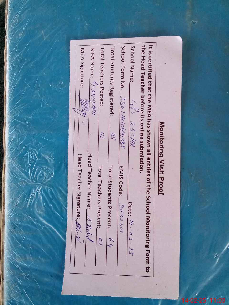 | Attendance Register | Head Teacher | MEA with School | Visit Proof |