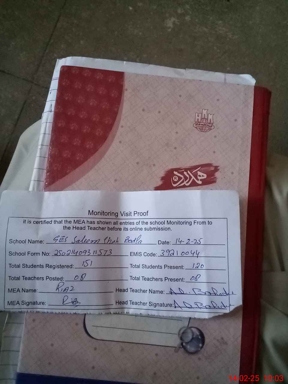 | Attendance Register | Head Teacher | MEA with School | Visit Proof |