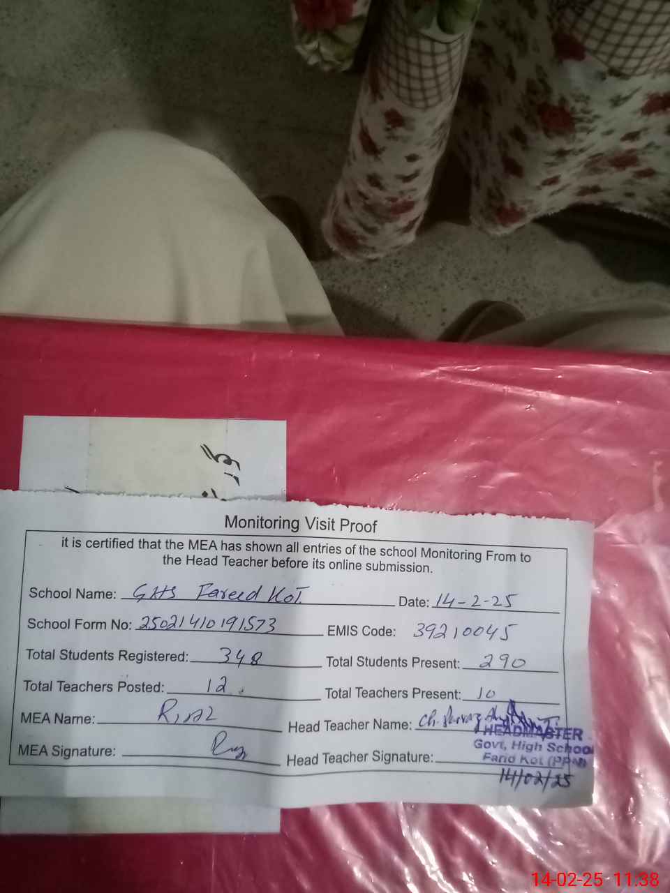 | Attendance Register | Head Teacher | MEA with School | Visit Proof |