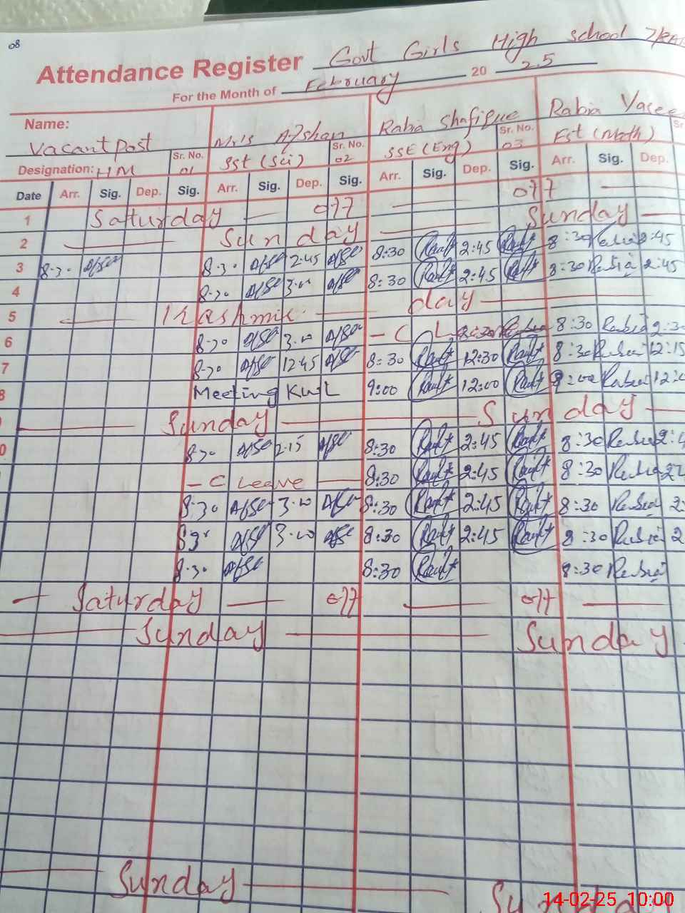 | CNIC | Full Name | Designation | R/C | Absence During Last Calender Month |
