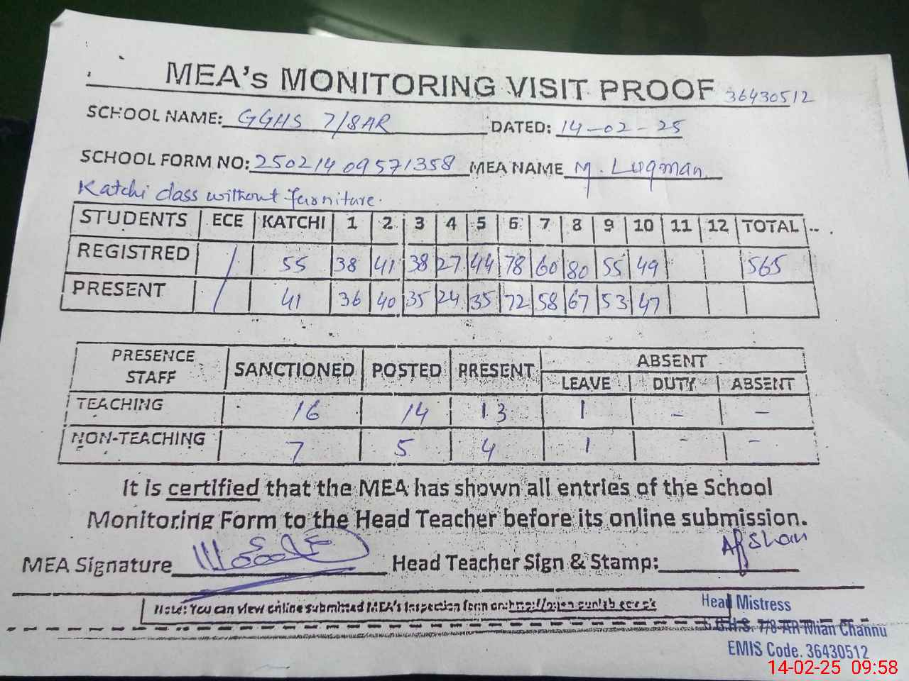 | Attendance Register | Head Teacher | MEA with School | Visit Proof |