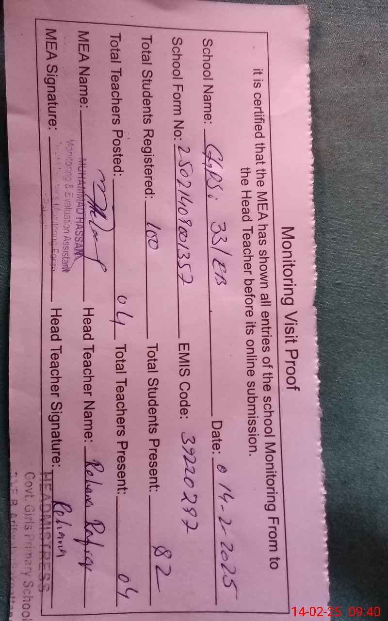 | EMIS Code: 39220297 | Name of School: GGPS 33 EB | |||