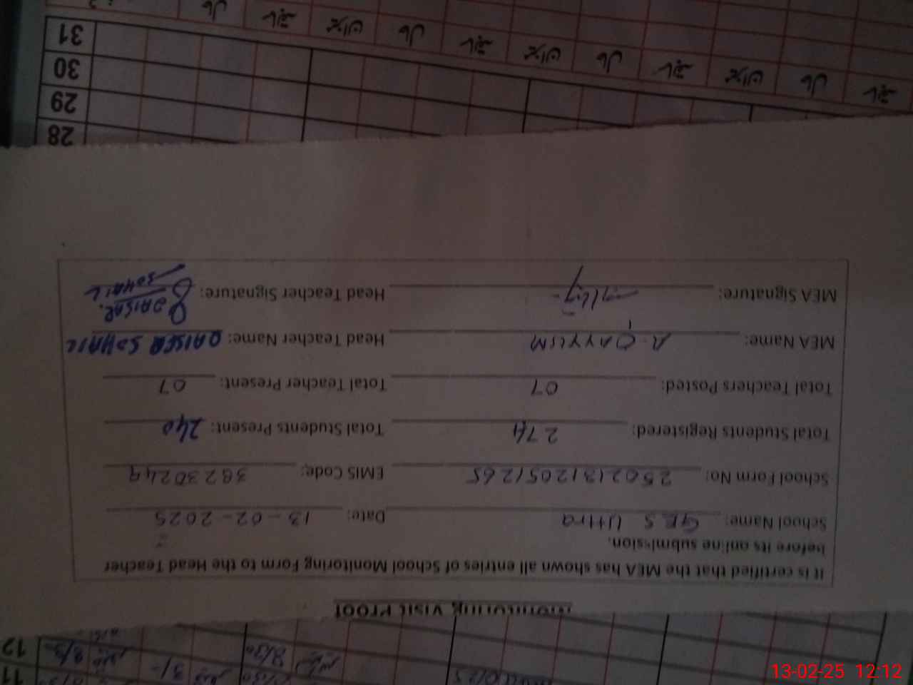 | Attendance Register | Head Teacher | MEA with School | Visit Proof |