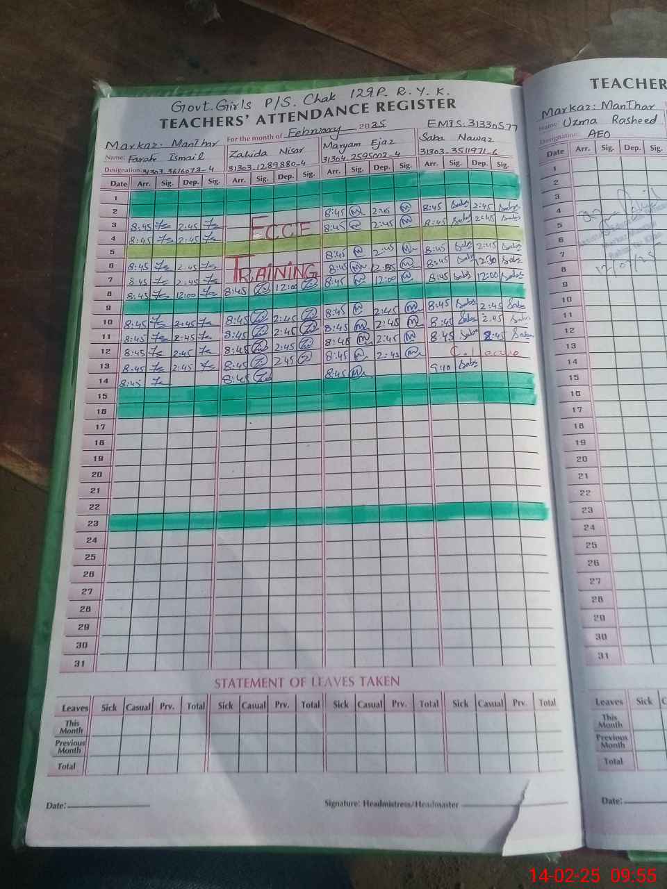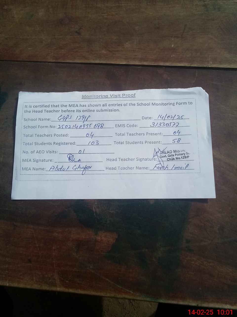 | Attendance Register | Head Teacher | MEA with School | Visit Proof |