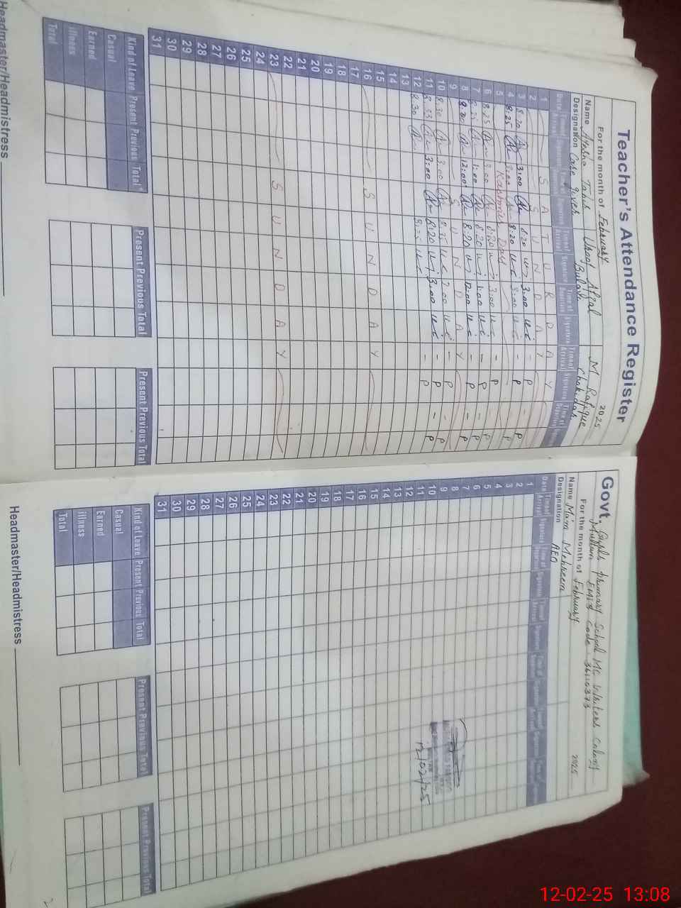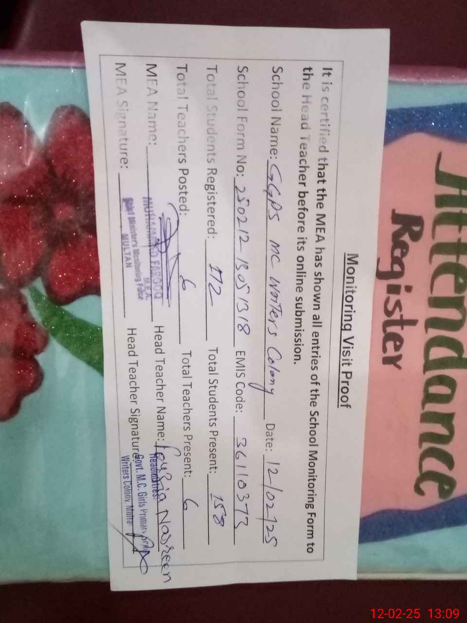 | Attendance Register | Head Teacher | MEA with School | Visit Proof |