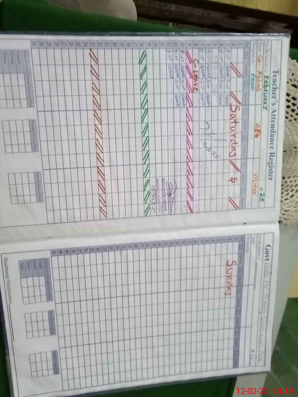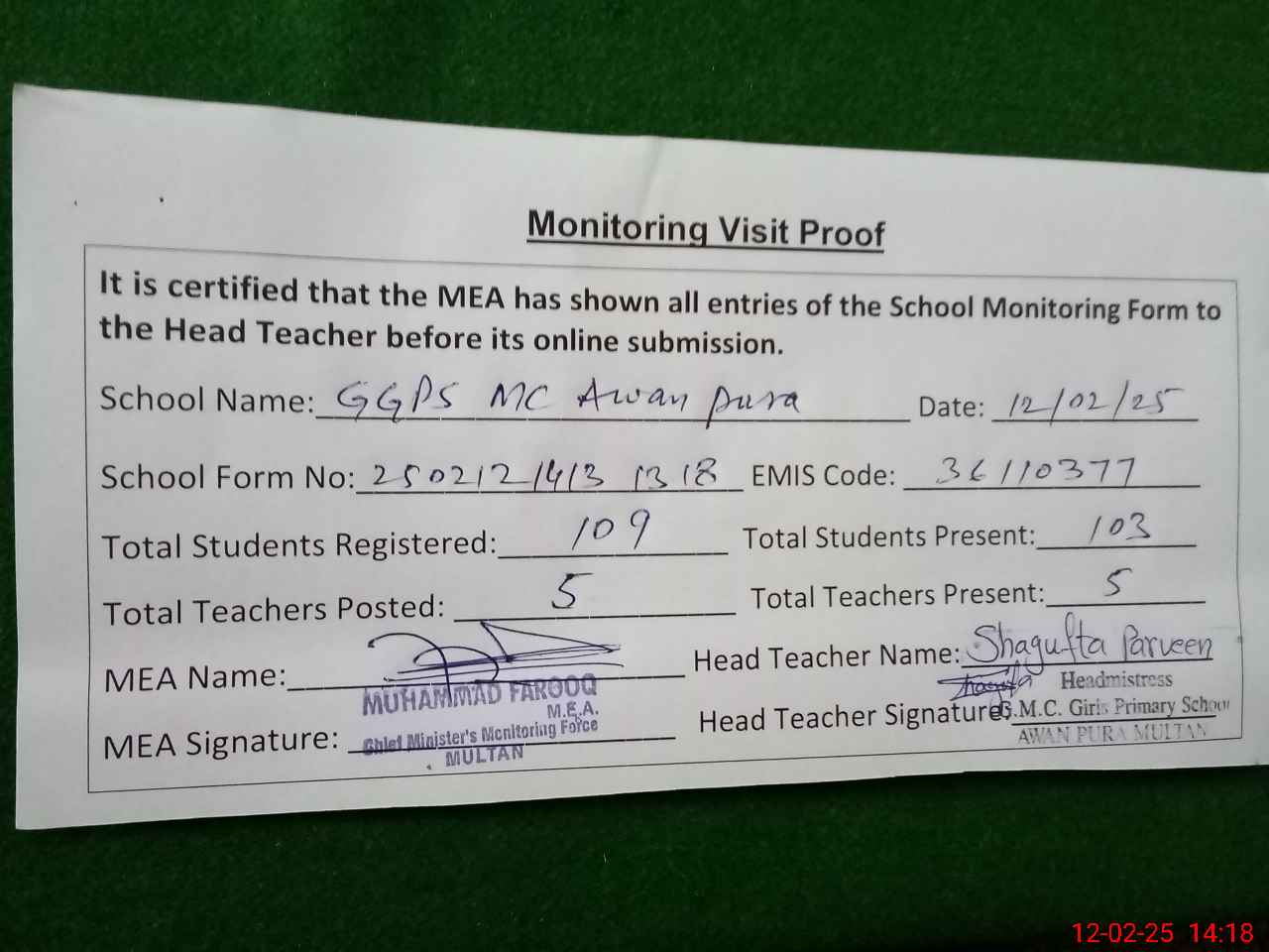 | Attendance Register | Head Teacher | MEA with School | Visit Proof |