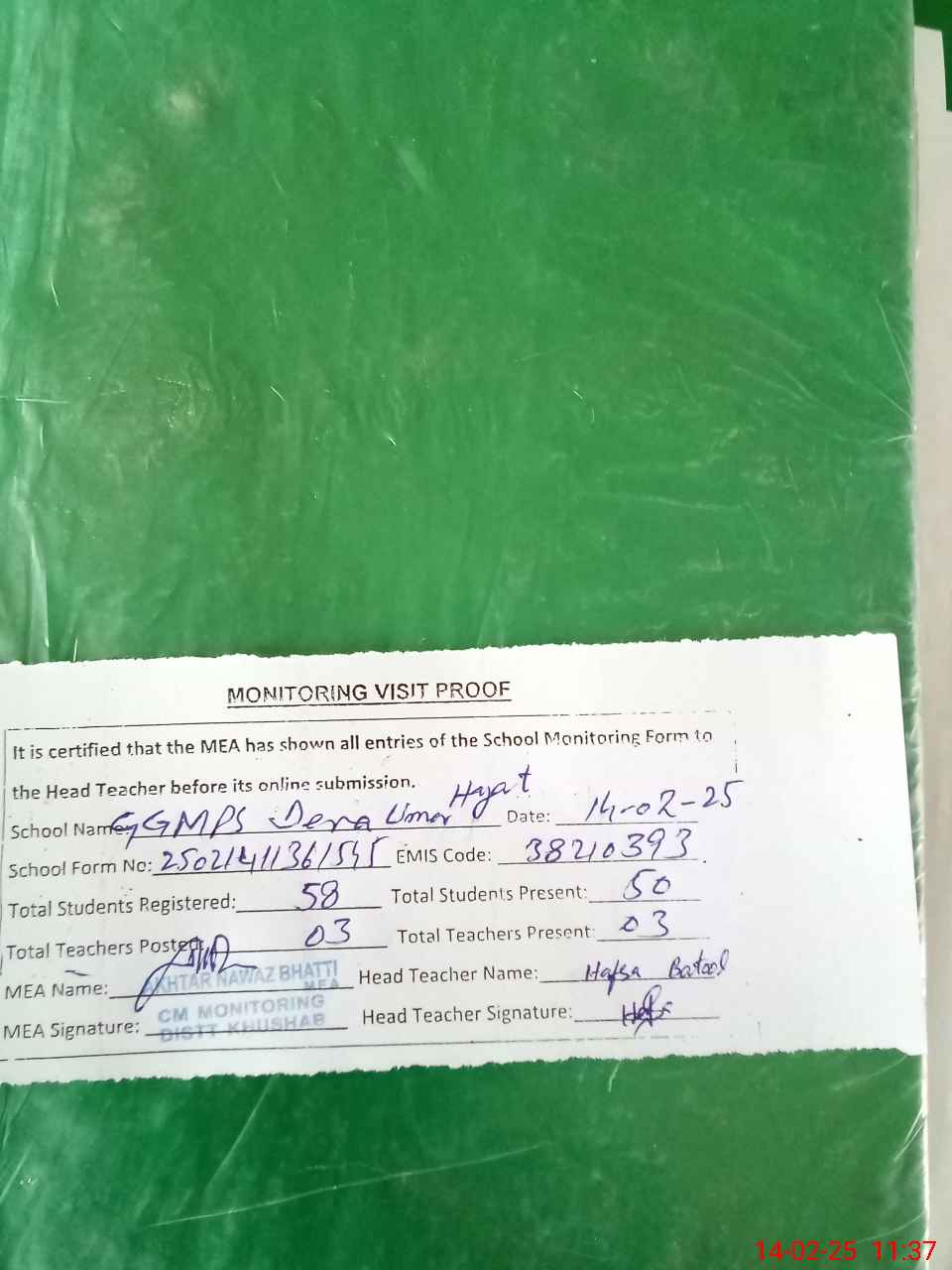 | Attendance Register | Head Teacher | MEA with School | Visit Proof |