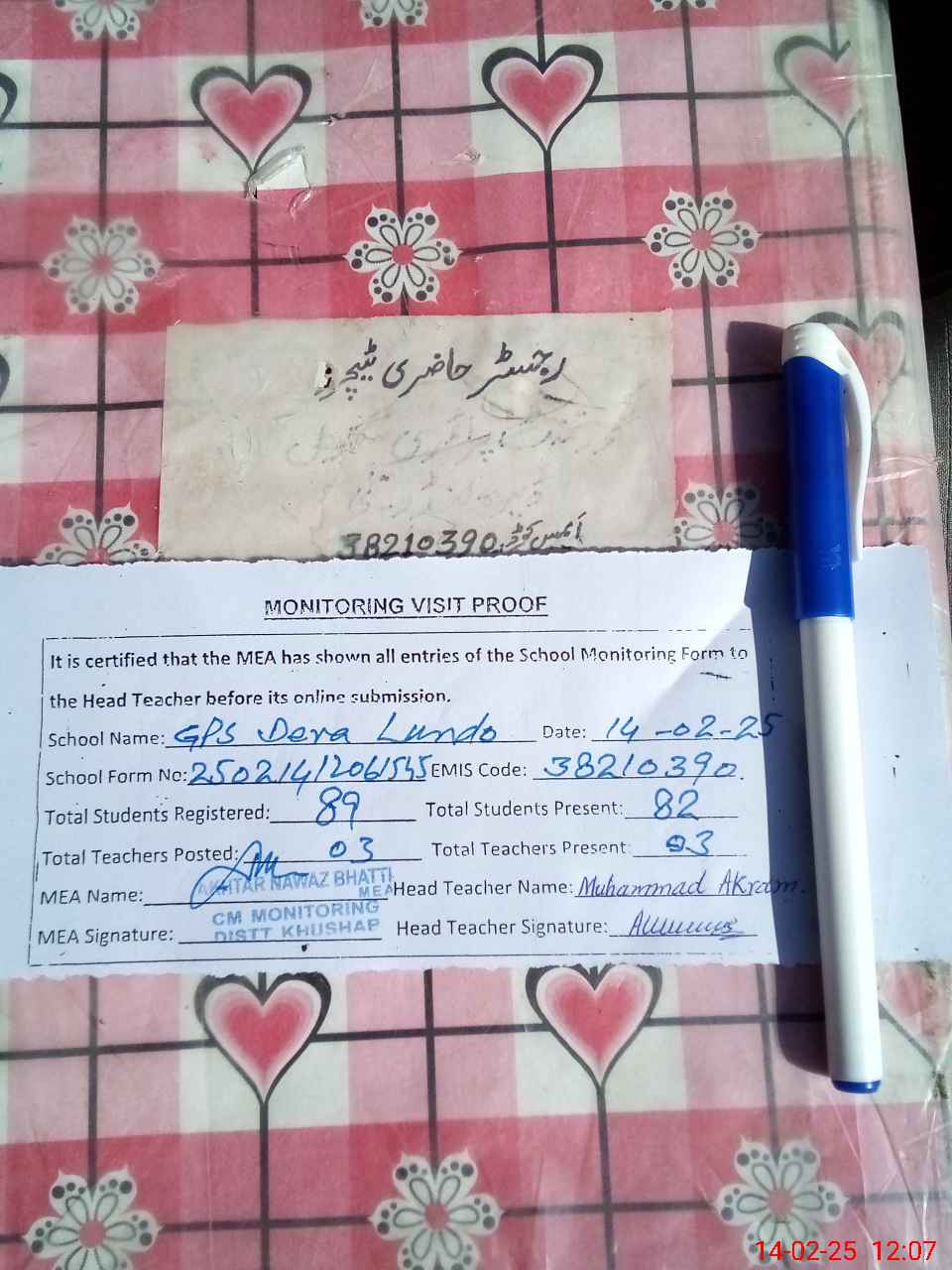 | Attendance Register | Head Teacher | MEA with School | Visit Proof |