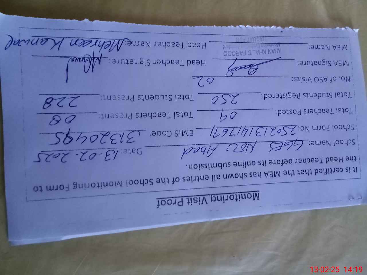 | Attendance Register | Head Teacher | MEA with School | Visit Proof |