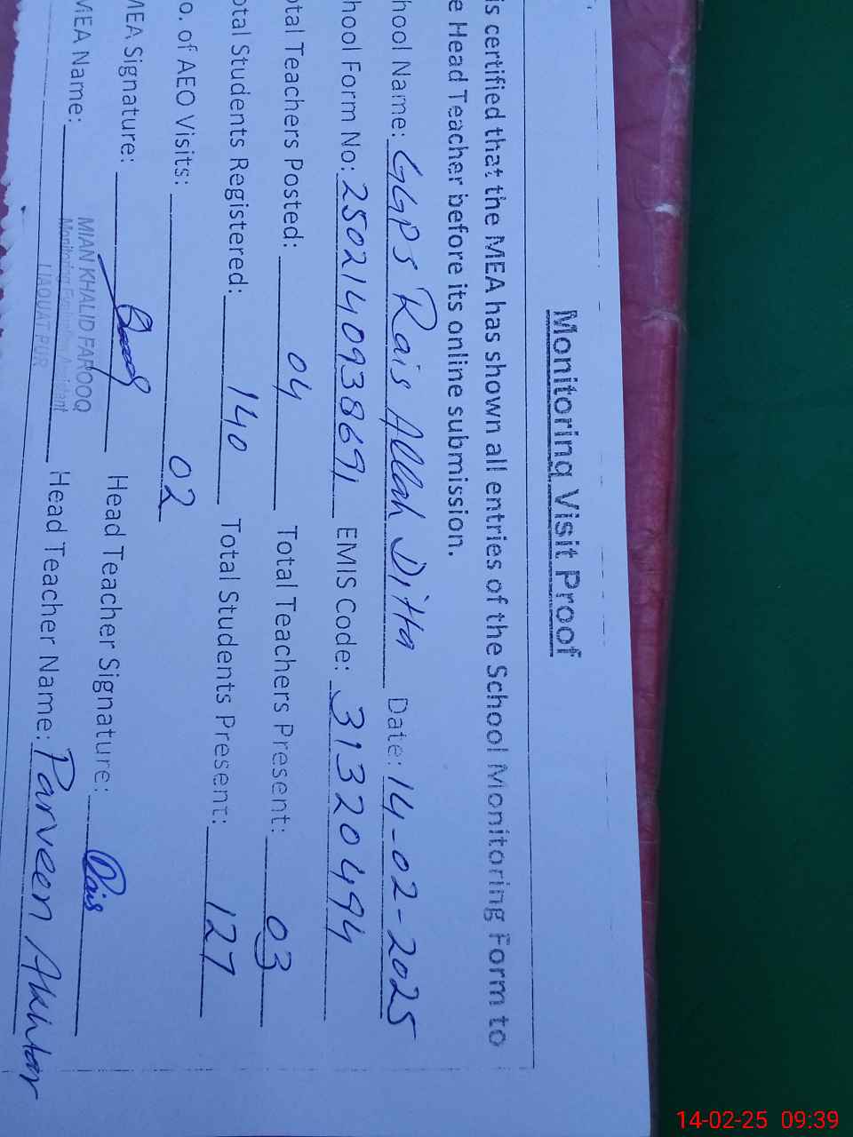 | EMIS Code: 31320494 | Name of School: GGPS RAIS ALLAH DITTA | |||