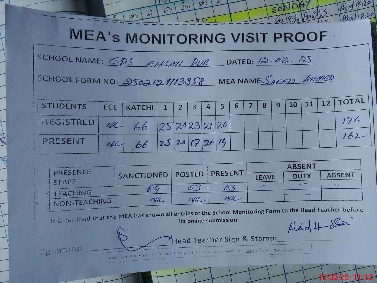 | Attendance Register | Head Teacher | MEA with School | Visit Proof |