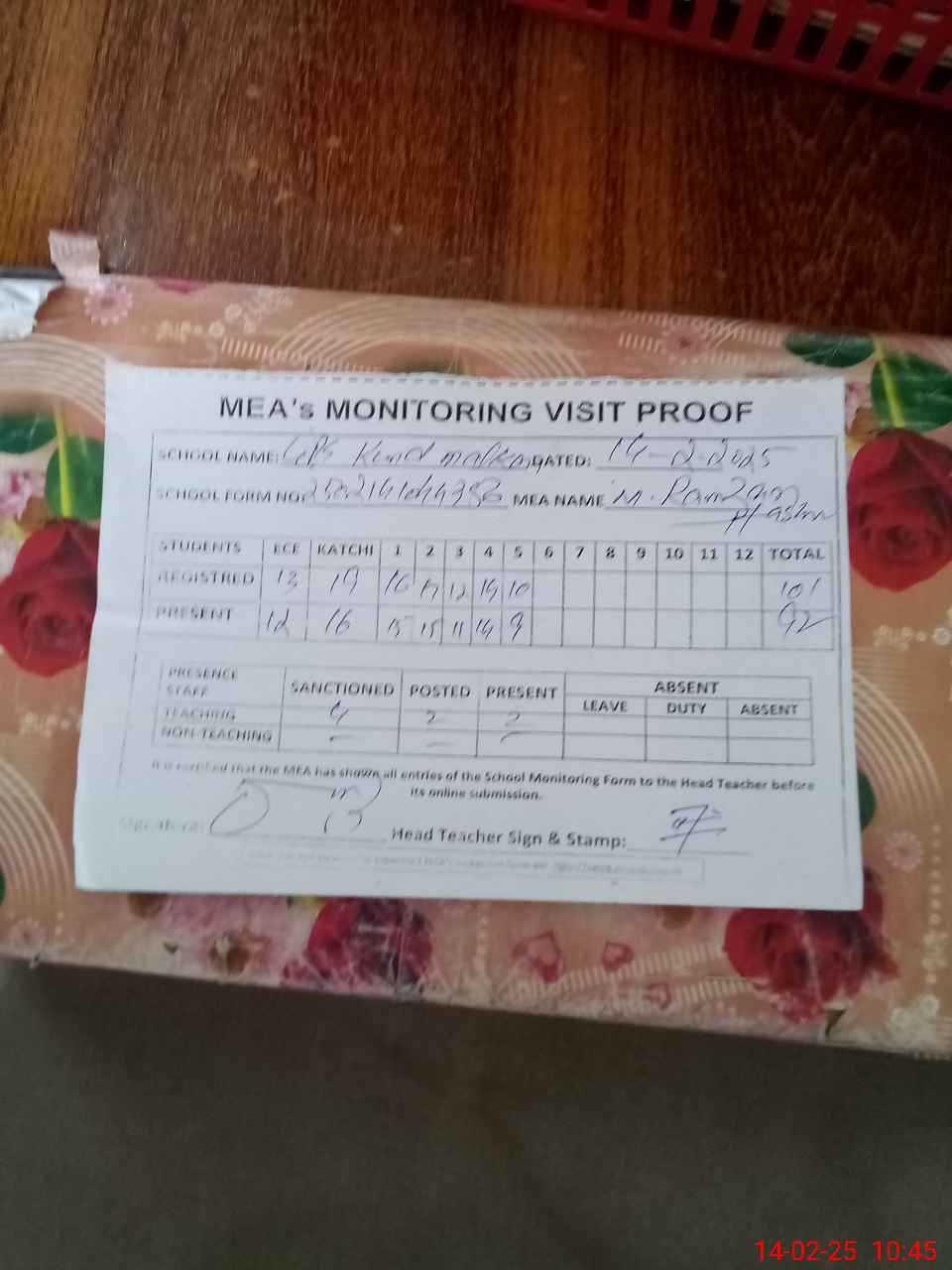 | Attendance Register | Head Teacher | MEA with School | Visit Proof |
