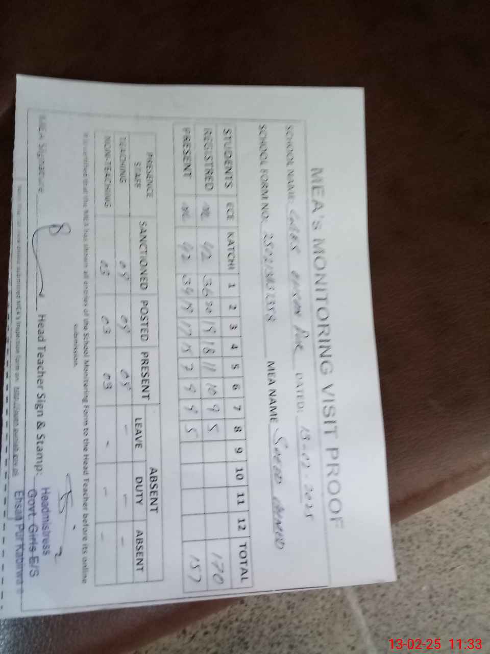 | Attendance Register | Head Teacher | MEA with School | Visit Proof |
