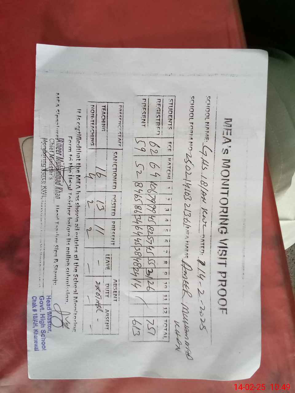 | Attendance Register | Head Teacher | MEA with School | Visit Proof |